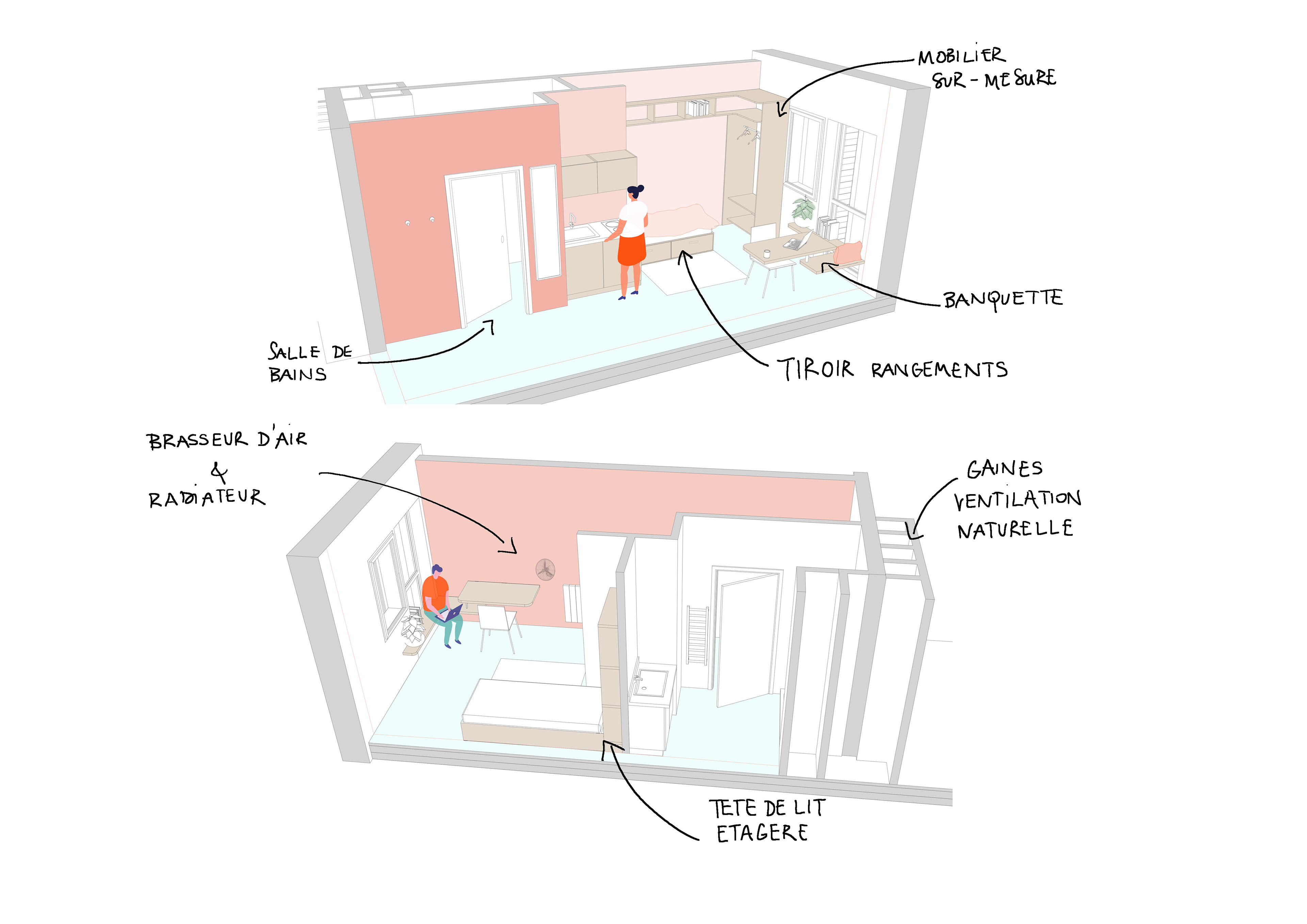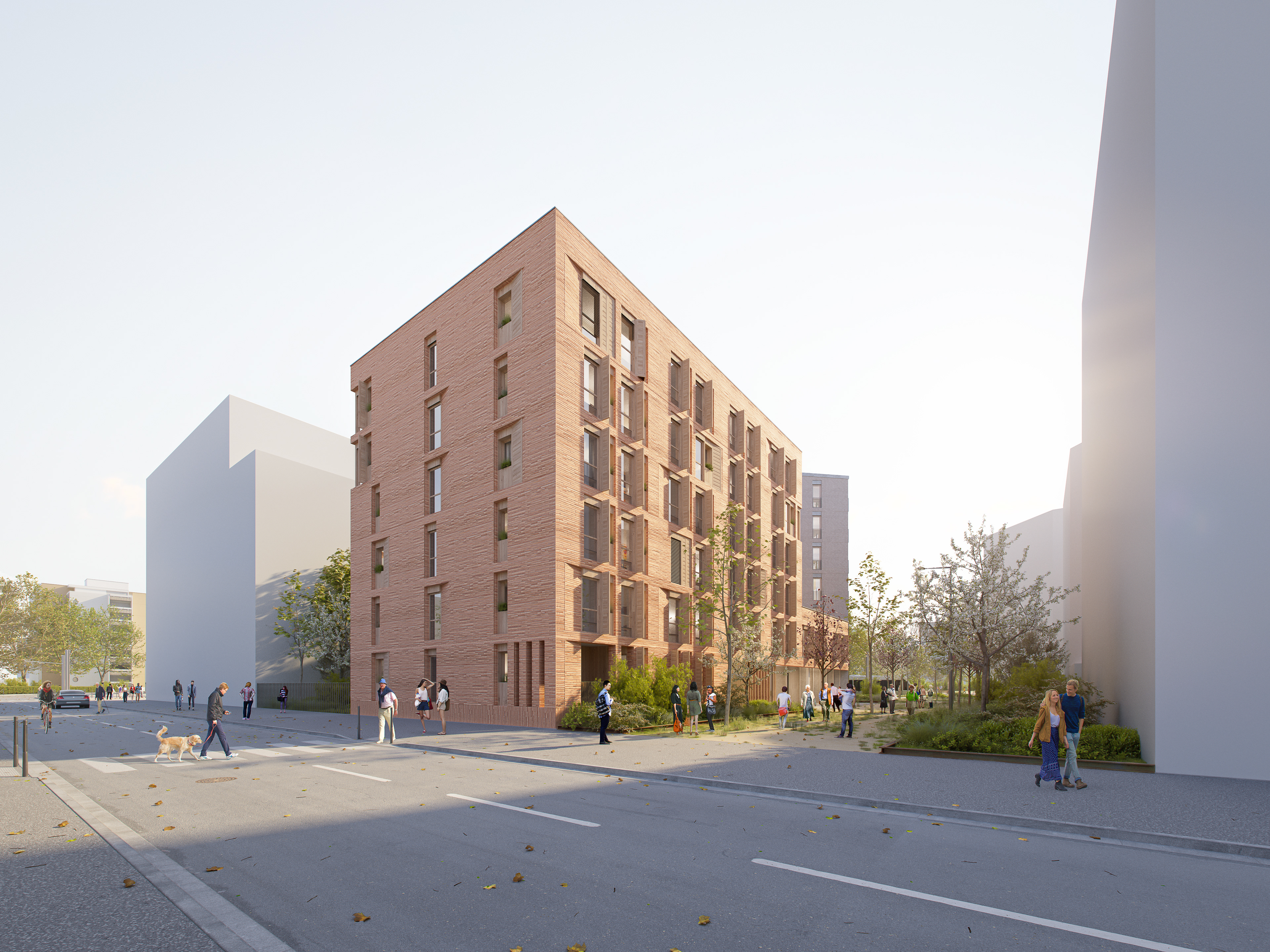 Les +/ RE 2020 seuil 2025 / Façade à Ossature Bois / Parement brique de réemploi 100% / Ventilation naturelle de l'ensemble des chambre étudiante par création de cheminées individuelles